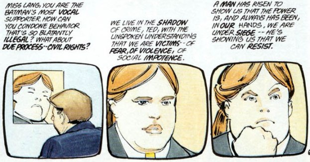 Em um programa de TV o âncora se dirige a Lana Lang, uma das poucas defensoras do Batman na mídia: “Como pode apoiar uma conduta tão ilegal, que viola justiça e direitos humanos?” (notem que no original é “direitos civis”)  e a resposta “Nós vivemos à sombra do crime, Ted, com a silenciosa certeza de que somos as vítimas… do medo, da violência e da impotência social. Um homem se ergueu para nos mostrar que o poder está e sempre estará em nossas mãos. Nós nos encontramos cercados e sob ataque. Ele está mostrando que podemos resistir”. O mesmo poderia ser dito de Hitler durante a República de Weimar, e todos nós sabemos como tudo isso terminou.