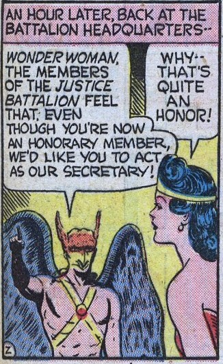 Gavião Negro: “Mulher Maravilha, os membros do Batalhão da Justiça gostariam que, mesmo que agora você seja um membro honorário, que você fosse nossa secretária”; Mulher Maravilha: “Puxa! É uma grande honra!”(All-Star Comics #13, 1942)