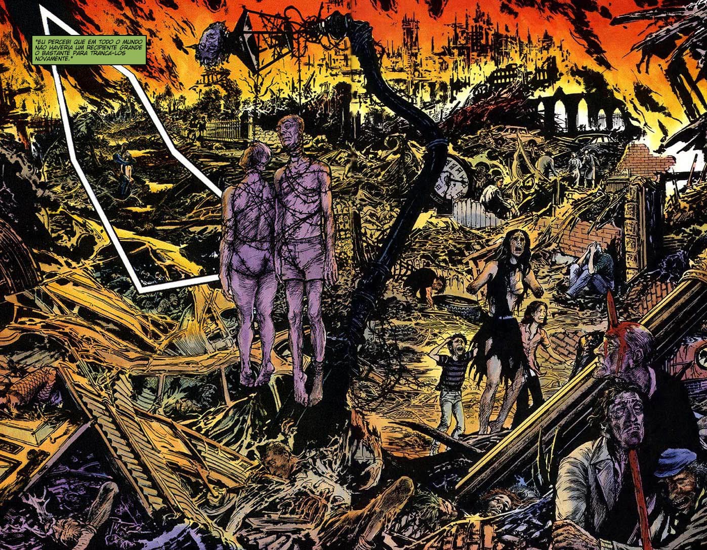 Note-se os corpos empalados, as peles de pessoas penduradas como roupas em varais, as crianças de olhos arrancados, a chuva de membros decepados. A inspiração da imagem, segundo Moore, foram as telas O Triunfo da Morte, do pintor belga Pieter Bruegel…
