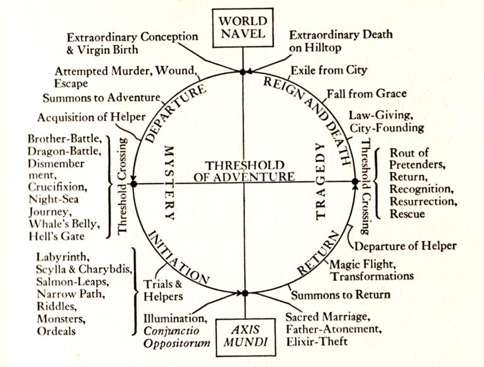 “Separando-se dos seus e, após longos ritos iniciáticos, o herói inicia suas aventuras, a partir de proezas comuns num mundo de todos os dias, até chegar a uma região de prodígios sobrenaturais, onde se defronta com forças fabulosas e acaba por conseguir um triunfo decisivo. Ao regressar de suas misteriosas façanhas, ao completar sua aventura circular, o herói acumulou energias suficientes para ajudar e outorgar dádivas inesquecíveis a seus irmãos” (BRANDÃO, Junito de Souza. Mitologia Grega. Petrópolis: Vozes, Vol. III, 1992. p. 23).