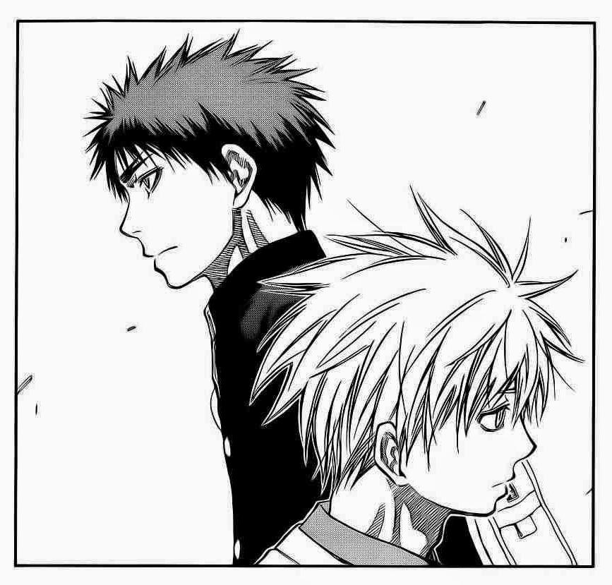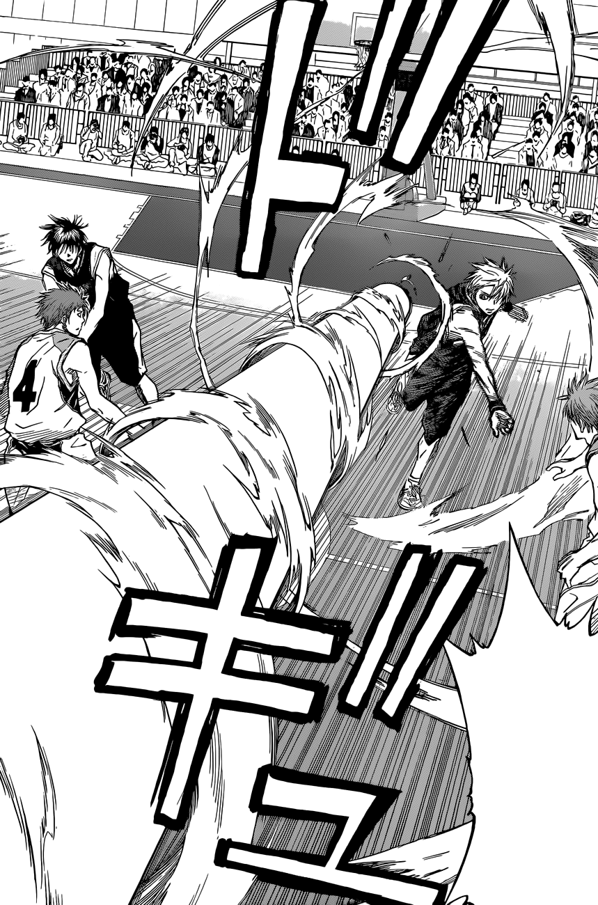 Kuroko_uses_Ignite_Pass_KaiKnB exagera muito no clima de artes marciais. Pense em Dragon Ball Z, mas coloque uma bola de basquete cortando o ar em alta velocidade no lugar das rajadas de energia e você terá uma boa idéia de como a maioria das partidas é resolvida na história. De fato, houve vários momentos em que imaginei ver um supersayajin aparecendo no meio do jogo.O problema de KnB é que as personagens principais já começam sua jornada num nível muito acima do que poderia ser considerado humanamente normal. Isso exige que o escritor e desenhista Fujimaki Tadatoshi transforme o que deveria ser um torneio de basquete intercolegial no Japão em uma verdadeira teomaquia, uma guerra de deuses adolescentes (muitos têm a mesma cara, o que dificulta um pouco na hora de acompanhar a série) que usam o basquete como argumento num intenso debate sobre o que consideram verdadeiro.