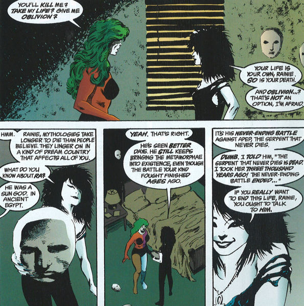 O que fazer quando sua vida realmente não tem nenhum sentido e pior, você já constatou inúmeras vezes que não tem como se matar? O conto que mostra a visita da Morte, irmã de Sandman, à Garota-Elemental, é uma espiral trágica. Mas com um desfecho reconfortante. Por acaso vale para toda a humanidade. Que é a vida senão um descarte de velhas máscaras?