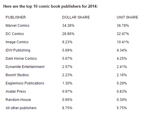 Ranking de vendas por editora de 2014. Fonte: http://blogs.wsj.com/speakeasy/2015/01/09/best-selling-comics-2014/?mod=WSJ_LifeStyle_Speakeasy