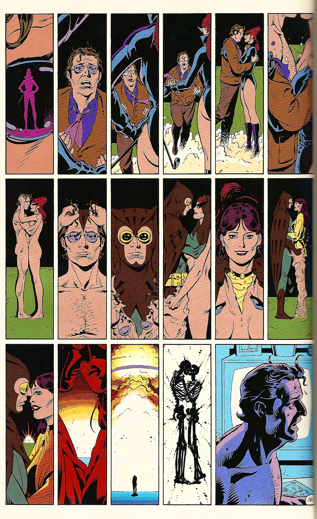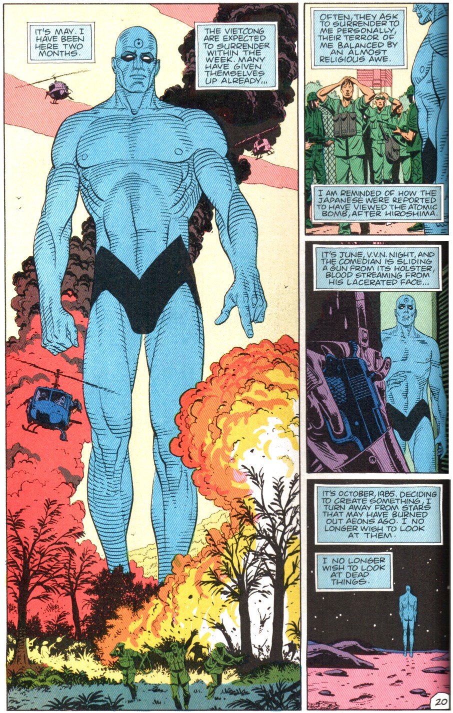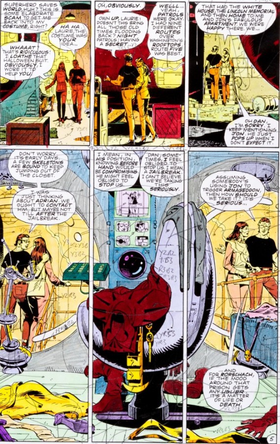 O propósito da forma rígida é portanto conduzir o leitor/espectador/ouvinte. Por isso o gênio Alan Moore abusa desse recurso. Na história do Coruja em sua relação com a Espectral algumas páginas chegam a ter 12 ou 17 painéis, mostrando o ritmo da pulsação do personagem diante do seu objeto de desejo. Os quadros da história do Dr. Manhatan têm uma flutuação grande na quantidade de painéis por página, especialmente quando a narrativa pula de forma não linear entre passado, presente e futuro.