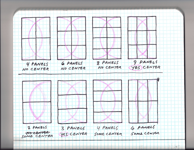 Os páginas de 9 painéis são também uma forma de linguagem rítmica hipnótica que cria a atmosfera onde o leitor entra. As variações dentro dessa estrutura rígida podem aumentar ou diminuir o ritmo da ação como nos exemplos abaixo de uma cena de ação frenética sem falas em 9 painéis (Capitão America de Jack Kirby) ou de uma cena conjugal mais lenta em 6 painéis, 3 deles dividindo o tempo de uma mesma cena (Watchmen de Gibbons).