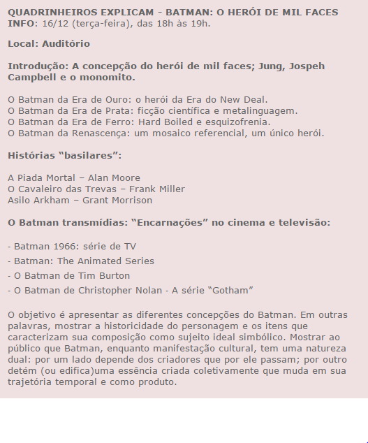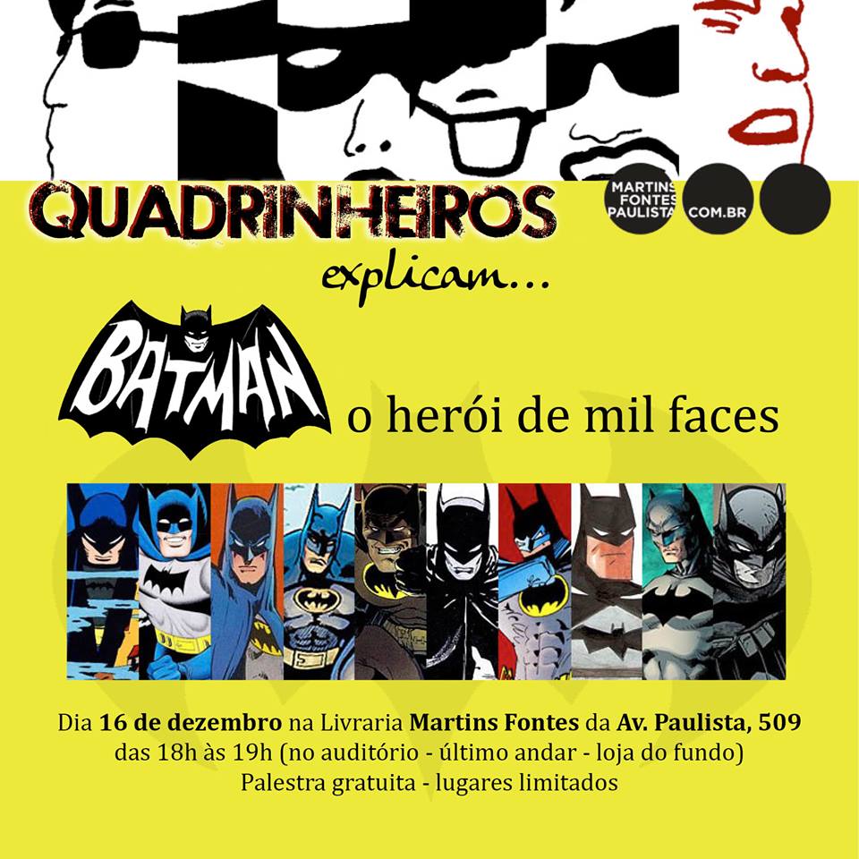 Convidamos você para o nosso primeiro Quadrinheiros Explicam ao vivo! O tema será os 75 anos do Batman e rola no dia 16 de dezembro na Martins Fontes da Paulista. Detalhe no folder abaixo: