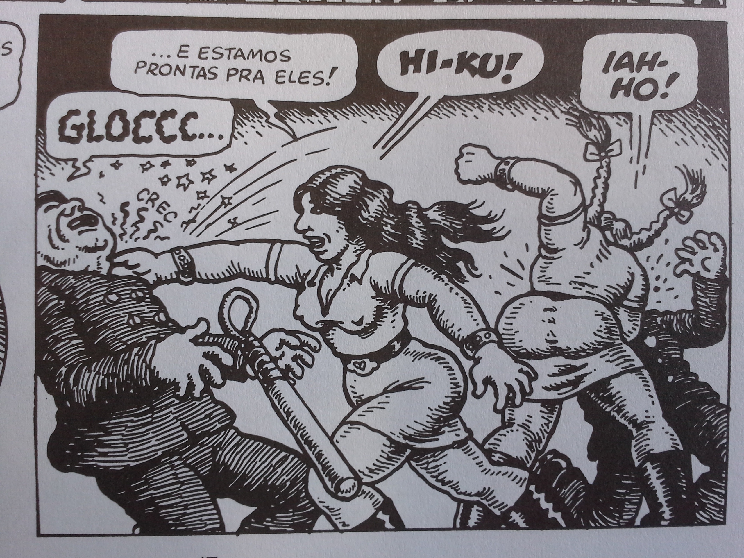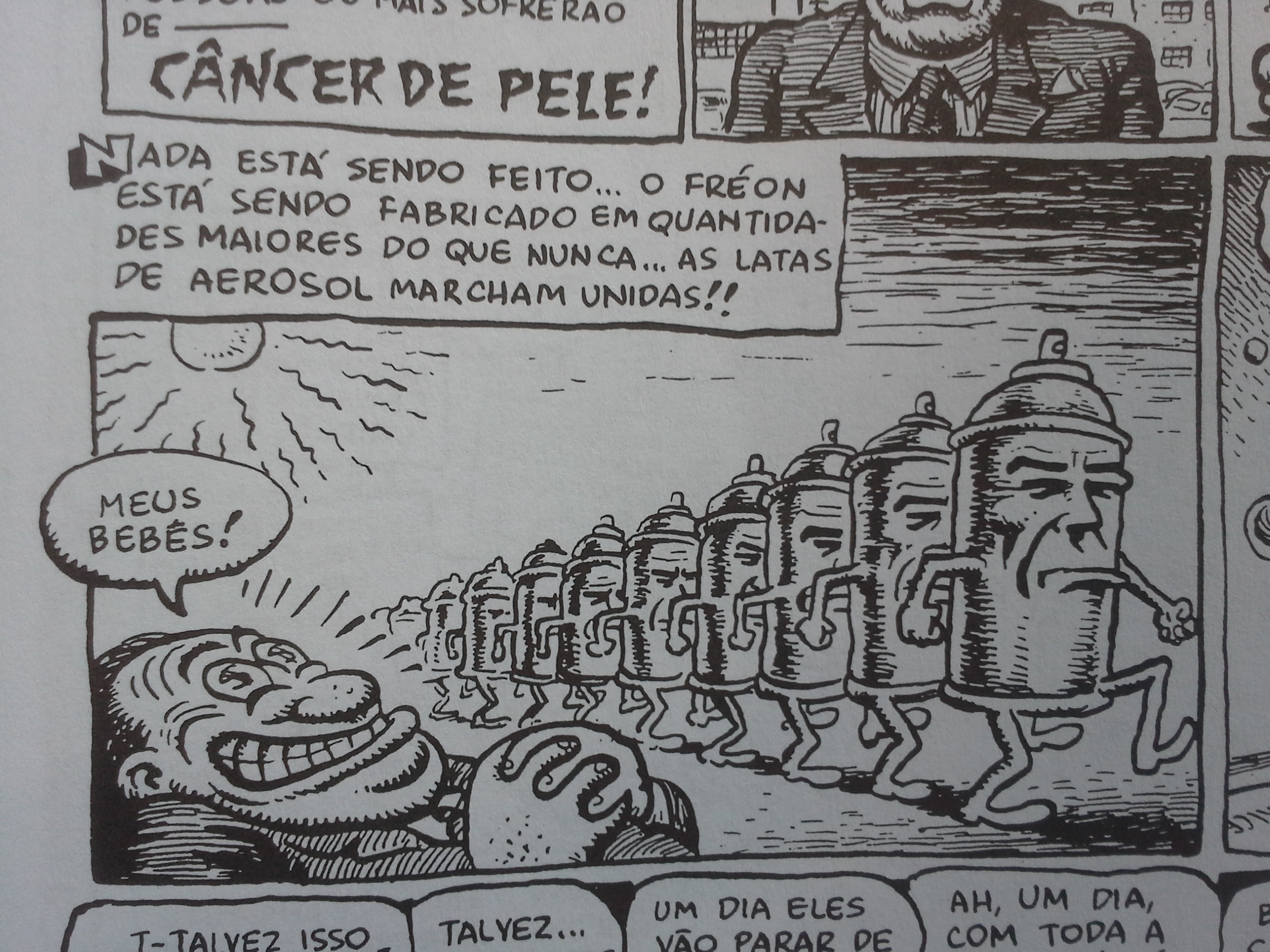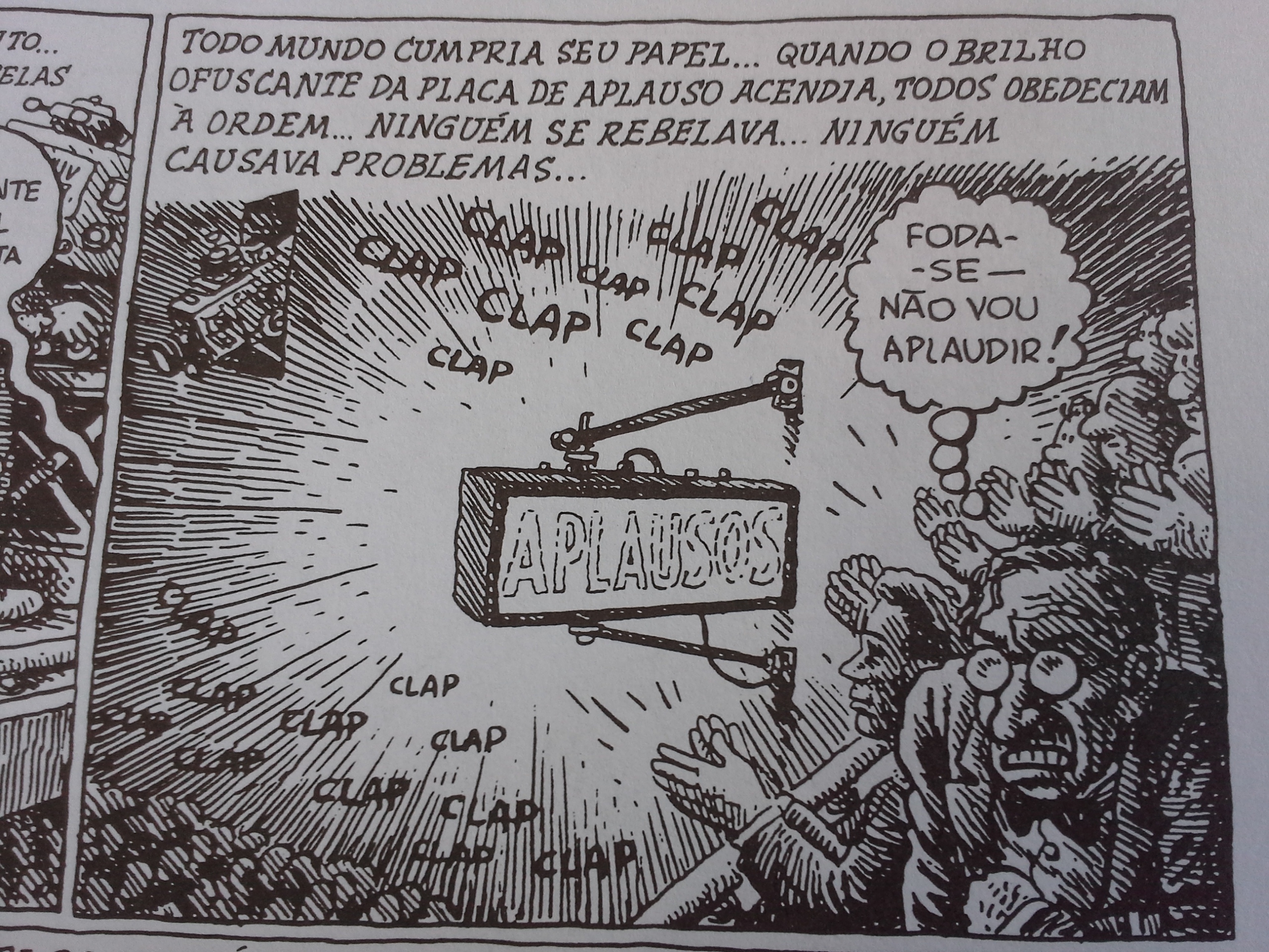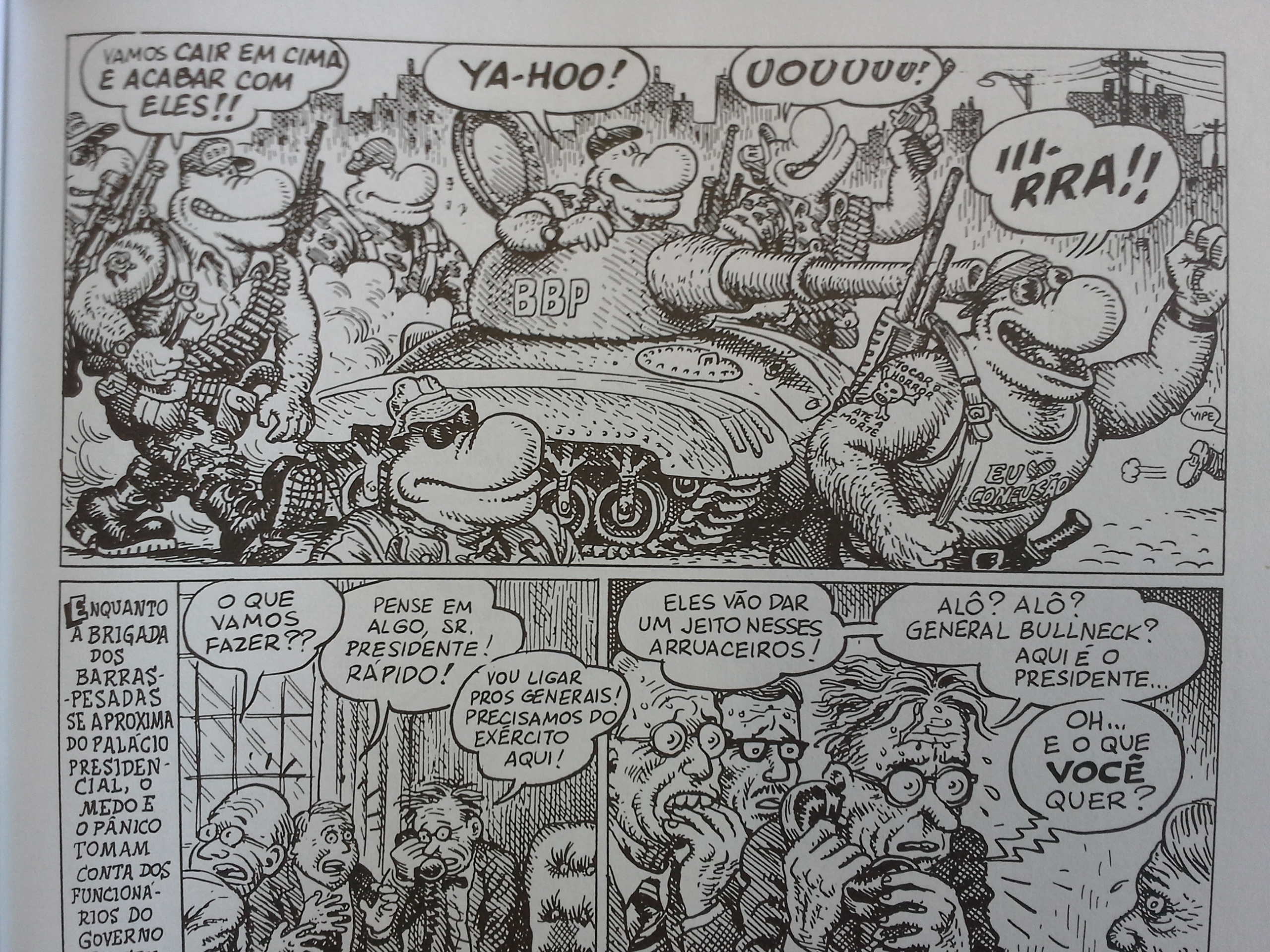 O álbum reúne pouco mais de 20 histórias em quadrinhos, de modo geral bem brigonas e pessimistas… algumas menos histórias e mais manifestos em quadrinhos, escritas entre 1973 e 1989. Ah, digno de nota também é que a tradução ao português foi feita pelo escritor (que também já se aventurou no mundo dos quadrinhos) Daniel Galera.