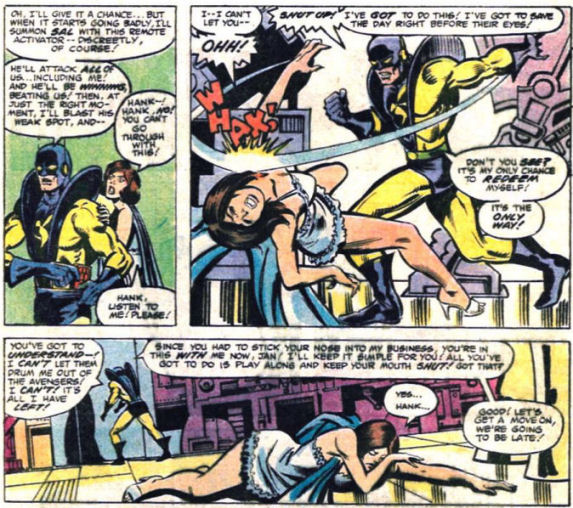 No roteiro de Jim Shooter, Henry Pym (naquele momento o Jaqueta Amarela) enfrenta um julgamento dentro dos Vingadores por seu comportamento (incluindo a criação de Ultron). Ele desconta sua frustração batendo em Janet que o denuncia levando à sua expulsão dos Vingadores.