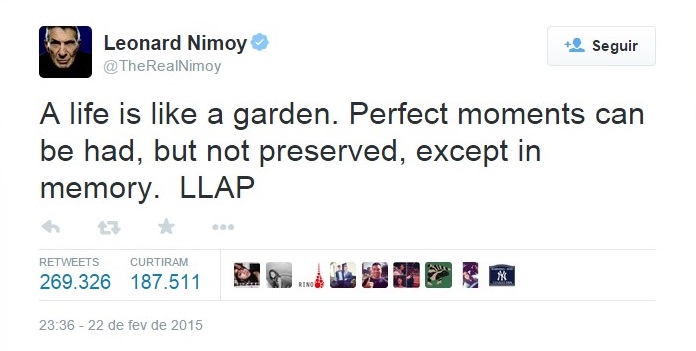Tivesse silenciado da fama e desaparecido sem alarde anos atrás, Nimoy não receberia honras menores depois de sua morte. Mas poucos dias antes de falecer, o ator ainda postou uma mensagem no twitter que só reafirmou o porquê dele exercer, com toda razão, tamanho carinho, respeito e veneração entre fãs.