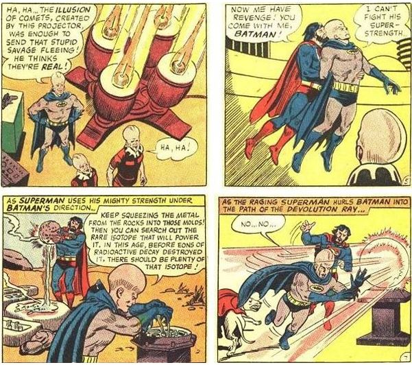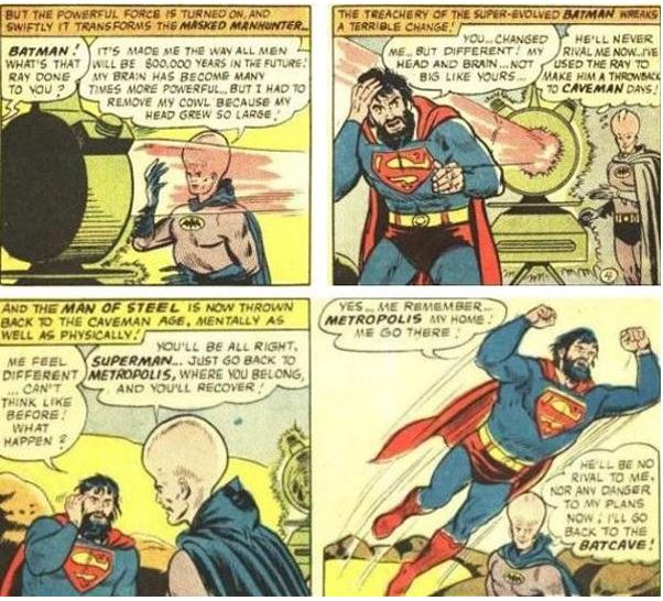 Outra típica da Era de Prata. Batman se torna um gênio do mal e transforma o Superman em um neandertal. Mesmo assim o Super ainda o força a criar uma máquina para que voltem para suas formas originais. Inteligência vence a força bruta? Nem sempre.