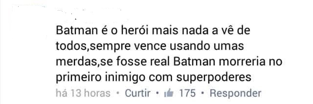 No proprio universo, acho batman um personagem genial, mas num universo de superherois, o minimo q posso dizer é q é um personagem ridiculo. Obvio q existem personagens sem poderes (nem armas especiais) no universo de superherois, mas sempre sao mostrados com suas limitacoes (se levamos em conta q no universo de super herois, estes sao seres “superiores”). E os fãs do Batman tem q admitir q sempre q ele aparece junto com outros superherois, os poderes deles sao diminuidos e surge do nada um subterfugio pro Batman salvar o dia com sua inteligencia superior ou com o seu bumerangue magico.
