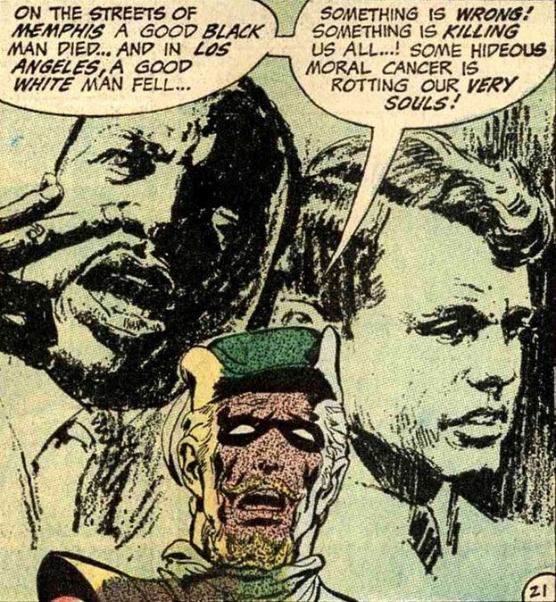 Na DC, o “ponto de virada” quanto à abordagem de problemas reais se deu a partir de 1970, com o crossover entre o Arqueiro Verde e o Lanterna Verde feito por Neal Adams e Dennis O’Neil — anos depois de a Marvel ter lançado a tendência. Mas ambas as editoras apenas expressavam a efervescência de sua época: na década de 1960 e início de 70, o movimento dos direitos civis, a revolução sexual, a contracultura, o surgimento da chamada “Nova Esquerda”, os protestos contra a Guerra do Vietnã, a ascensão da retórica revolucionária na onda da revolução Cubana e dos movimentos anticoloniais — para citar só alguns elementos mais visíveis na perspectiva norte-americana — tornaram-se parte das notícias cotidianas para milhões de pessoas. O mundo, e os EUA em particular, se transformava rapidamente entre turbulências políticas e convulsões socioculturais.