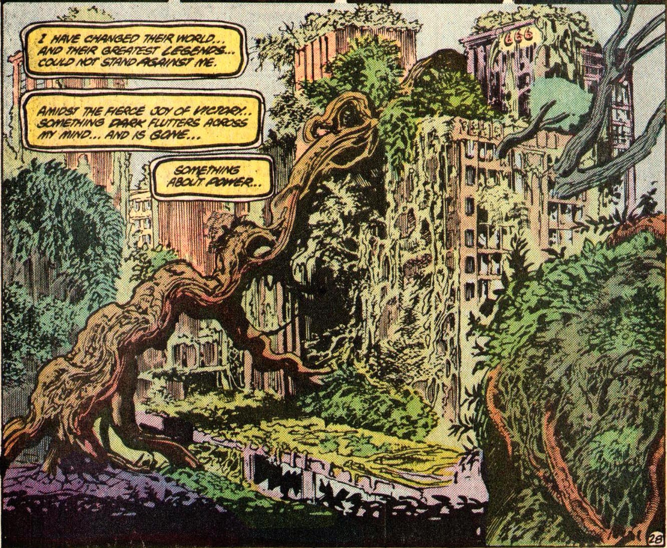 02Lembrando de A Saga do Monstro do Pântano, de Alan Moore, na história em que o Monstro invade Gotham, transformando todos os cantos do lugar em vegetação, acontecem algumas observações importantes. Frutas crescem nas ruas, flores nos becos e em todos os locais possíveis, dessa forma as pessoas não precisavam pagar pelo alimento dentro da cidade, desde os mais pobres até Bruce Wayne podiam comer ótimas frutas sem pagar nada. Com o poder de aflorar a natureza onde bem entende, o Monstro do Pântano poderia facilmente acabar com a fome no mundo; o personagem toca nesse assunto, porém ele percebe que se resolver os problemas do homem não existirá uma conscientização, muito pelo contrário, ele vai destruir ainda mais o ambiente, pois terá sempre em mente que existe alguém para recorrer quando as coisas derem errado.