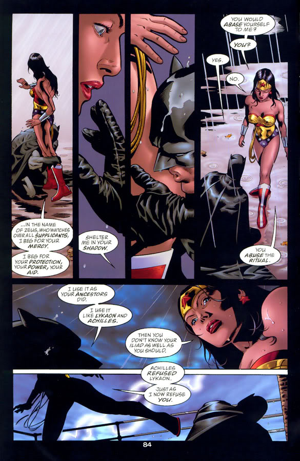 John Gould, em um artigo chamado Hiketeia aponta para o fato de que quando Aquiles recusa a hiketeia de Licaão e o mata, ele não está mais tocando o joelho de Aquiles, o que, ritualisticamente (ou seja, para a aplicação do ritual “conforme a tradição e a lei”), seria importante. Podemos notar que Diana afasta-se de Batman e este não mais toca seus joelhos no momento da recusa.