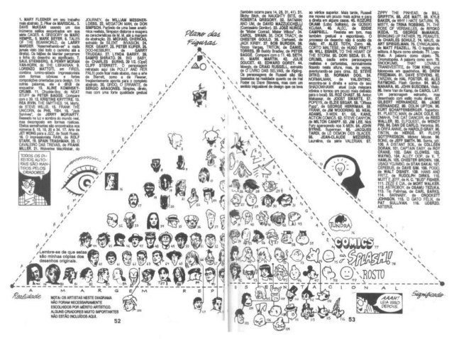 No final da base da pirâmide, no canto direito existe uma linha divisória que mostra uma separação. Da forma mais essencial ele passa para a palavra que nomeia aquele objeto, do rosto do emoji para a palavra ROSTO, que em sua forma escrita é também um desenho no papel. Mas existe uma diferença essencial as duas pontas desse salto. De um lado temos um elemento gráfico simplificado que imita/representa algo que reconhecemos com a visão, e de outro uma soma de elementos gráficos (letras) que representam o som da palavra que convencionamos para designar algo que reconhecemos pela visão. Então o que todas essas diferenças e separações significam quando lemos um comics?