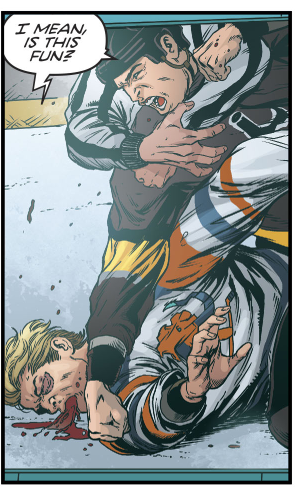 A violenta briga sem sentido entre dois jogadores de hockey (que leva um deles à morte) acompanhada da pergunta “Isso é diversão?” é uma clara crítica à violência gratuita que faziam as vendas subirem nos anos 90, um dos efeitos de Watchmen que inaugurou, juntamente com O Cavaleiro das Trevas, a chamada “Era de Ferro” dos quadrinhos, com heróis problemáticos e anabolizados.