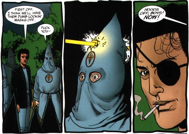 No decorrer das edições, o protagonista acaba encontrando os membros da KKK em uma reunião e, claro, isso não poderia terminar bem. Garth Ennis sempre representa o grupo ridicularizando-os – desde em seus diálogos mais cotidianos até em suas atitudes monstruosas – e representando-os como pessoas pequenas e fracas, assim como são em nosso contexto também.