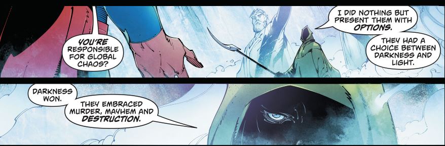 Superman: Você é responsável por esse caos global? Mr Oz: Eu não fiz nada além de lhes dar opções. Eles tinham uma escolha entre a escuridão e a luz. A escuridão venceu. Eles aceitaram o assassinato, caos e destruição.