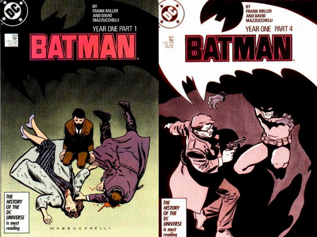 As capas da parte 1 e da parte 4 da minissérie são especialmente icônicas. As duas levam o olho do leitor a girar em torno dos contornos dos corpos e das sombras. Na primeira o jovem Bruce Wayne aparece de joelhos, emoldurado pelos braços dos corpos inertes de seus pais. A sombra pesada que é projetada no centro do corpo do jovem Bruce reforça a sensação de vazio e solidão, ao mesmo tempo que insinua a forma de um morcego. Na segunda o experiente Gordon desequilibrado (vejam a posição de seus pés), consegue sacar rápido sua arma diante de uma figura que se mescla com as sombras e busca o confronto físico. Mais uma vez a imagem gira em uma espiral vertiginosa. Mazzucchelli é – na minha opinião – o melhor desenhista de quadrinhos do planeta.