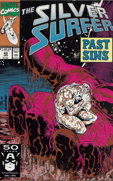 Diferente do que acontece hoje em dia, a capa, sozinha, me fez parar e querer ler a revista. O que poderia fazer com que o Surfista Prateado, um dos seres mais poderosos do universo, caísse de joelhos, de medo ou vergonha? Que águas eram aquelas, de onde a mão de Galactus o erguia? Por que o devorador de mundos, nêmesis do Surfista Prateado, se faria gentil com aquele que o desafiou?
