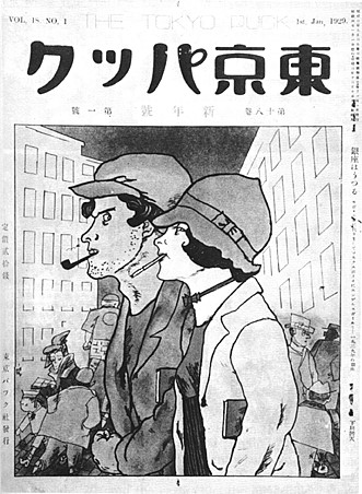 Baseado na revista Japan Puck, do inglês Charles Wirgman, o desenhista Rakuten Kitazawa, criou a revista Tokyo Puck. É possível perceber os traços caricaturais dos desenhos europeus. Se na revista de Wirgman alguns desenhos sobre o povo e governo japonês eram satirizados, na Tokyo Puck os ocidentais quem eram retratados. Interessante perceber também a grafia do nome da revista, pois os ideogramas japoneses estão grafados na horizontal, mas da direita para esquerda.