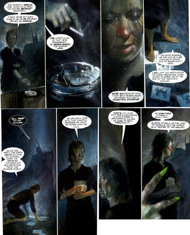 “É bem possível que estejamos olhando para um tipo de super-sanidade aqui. Uma fascinante nova evolução da percepção humana, mais apta à vida urbana no fim do século vinte. […] Diferente de eu e você, o Coringa parece não ter controle das informações sensoriais que ele recebe do mundo exterior. […] Por isso em alguns dias ele é um palhaço malicioso, noutros um assassino psicopata. Ele não tem uma personalidade real. Ele cria a si mesmo todos os dias.”