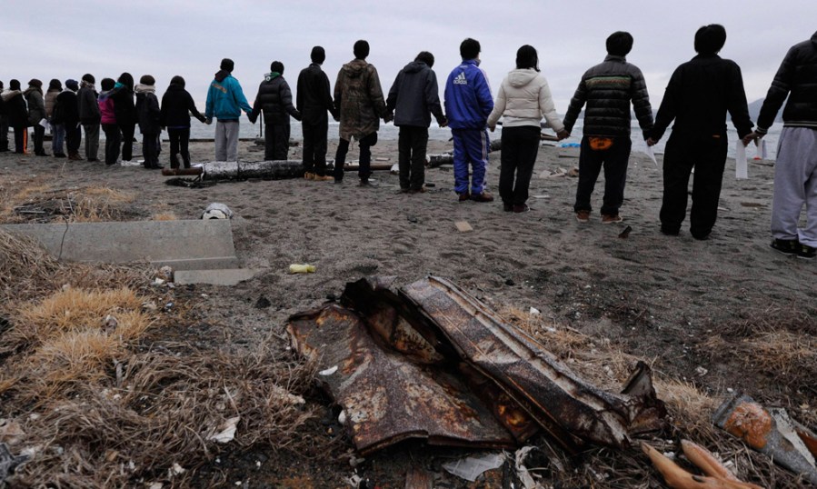 Os japoneses dão as mãos em memória as vítimas do tsunami de 2011 em Fukushima.