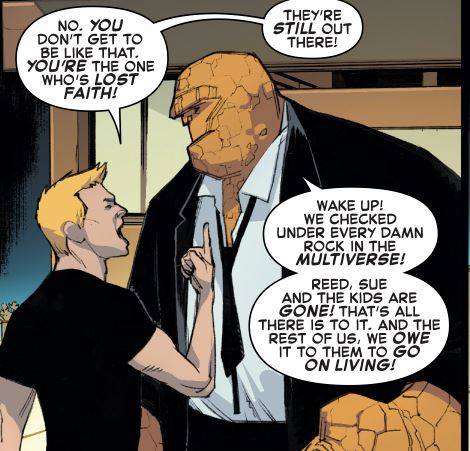 A edição #1 conta com várias histórias, mas a principal enfoca a falta que o Quarteto Fantástico nos faz por meio da raiva incontida do Tocha Humana e a resignação nostálgica de Ben Grimm, que lembra acontecimentos do passado, no melhor estilo Na minha época era melhor…