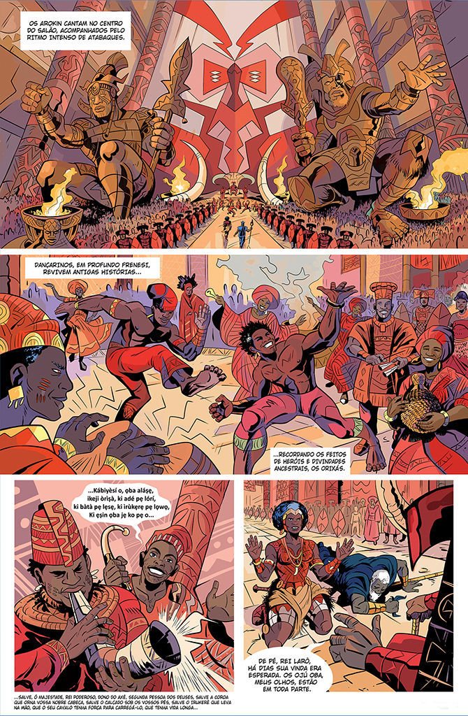 Na história em quadrinhos temos termos na língua Yorubá (há um glossário no final da edição), roupas, acessórios e marcas faciais de diferentes povos e reinos (fruto de uma pesquisa profunda) e o rosto de brasileiros que o artista recolheu pelas ruas de Salvador, reconectando assim as duas pontas dessa tradição. Além disso, durante a aventura os preconceitos que os séculos de cristianismo institucional impôs ao imaginário dos Orixás vai sendo desconstruído. Vemos um ritual de iniciação em seu contexto mitológico, entendemos a real dimensão do Axé, compreendemos o poder da natureza e nossa conexão profunda com ela.