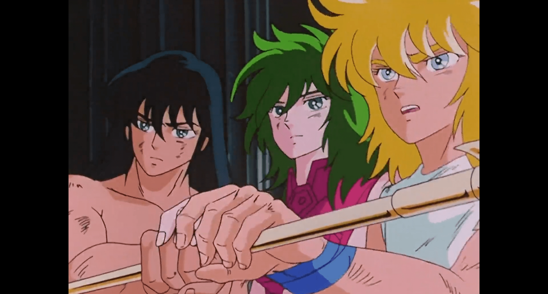 Shiryu, Shun e Hyoga colocando seus cosmos na flecha que Seiya usará para atacar Poseidon
