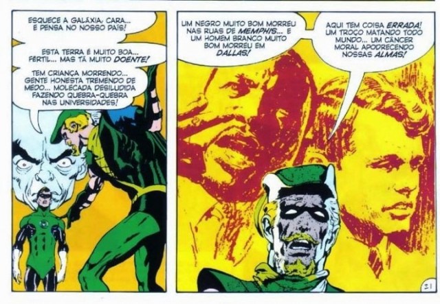 Desde sempre acontecem diversos encontros nos quadrinhos. Não foi diferente com a dupla verde mais famosa da DC Comics, Arqueiro Verde e Lanterna Verde na fase de Denny O’Neil e Neal Adams. A HQ desde o início apresenta um incisivo discurso político, onde a dupla esmeralda parte em uma viagem pelos EUA, descobrindo os problemas sociais e políticos do país. Um exemplo acontece na primeira história, em que o Lanterna Verde prende um rapaz por ter empurrado um homem mais velho. Logo em seguida o Arqueiro Verde explica que o rapaz se exaltou, pois ele cuida da avó de 80 anos que depende dele, e o homem está tentando despejar todos daquele prédio para transformar em um estacionamento, pois o lucro é maior.O Lanterna Verde diz que entende a dificuldade da situação, mas está apenas cumprindo ordens. Depois disso o Arqueiro Verde responde: “Eu já ouvi isso… Quando os criminosos nazistas foram julgados.”