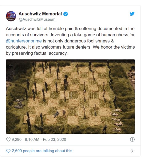 “Auschwitz foi repleta de dor e sofrimento conforme documentado pelos sobreviventes. Inventar um jogo de xadrez humano para @huntersonprime não é apenas perigoso e cartunesco. Isso também convida futuros negacionistas. Nos honramos as vítimas preservando a acuidade factual.”