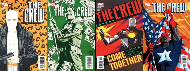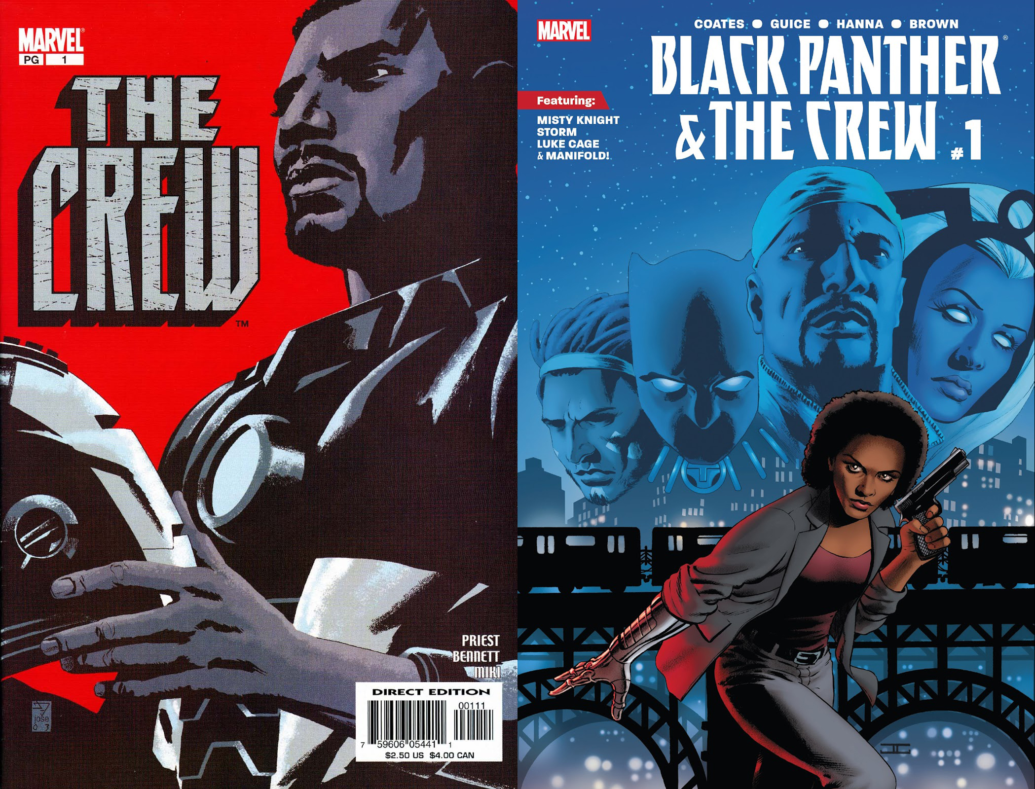 The Crew foi escrita pelo roteirista Christopher Priest e desenhada pelo nosso Joe Bennett. Priest escreveu histórias do Falcão e do Luke Cage pra Marvel, e do Aço para a DC. Foi responsável por todo o volume 3 do Pantera Negra, de 1998 a 2003 – quando foi cancelado. Então T’Challa migraria para as páginas de The Crew, que seria uma versão dos Vingadores só com heróis negros.