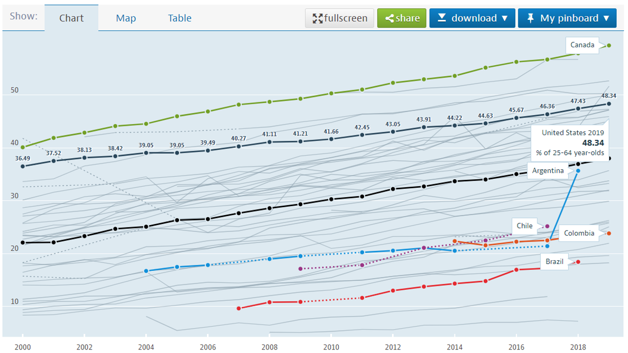 Segundo levantamento da Organização para a Cooperação e Desenvolvimento Econômico (OECD), o número de profissionais com formação superior no Brasil é inferior ao de países como Canadá (“vai, ok”), Estados Unidos (“claro!”), Argentina (“oi?”), Chile (o quê??), e Colômbia (WTF???)