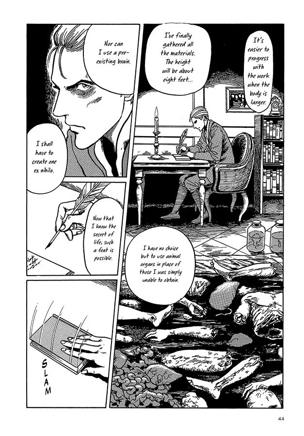 Dois fatos demonstram que essa parece ter sido a abordagem escolhida por Junji Ito: o tempo para apresentar e humanizar Victor Frankenstein e as ilustrações do protagonista que em grande parte das cenas possui um olhar sombreado com certo tom de arrogância e maldade imbuídos também em suas palavras e sentimentos. Essa unilateralidade na abordagem torna a adaptação exponencialmente mais pobre em conteúdo do que o livro original, pois na versão de Mary Shelley vemos Victor Frankenstein em diversos conflitos psicológicos, seu contexto infantil em detalhes, suas dúvidas, desejos, erros, acertos etc. A autora primeiro constrói o personagem e só depois apresenta seus erros e mazelas para que seja possível a identificação com o cientista.
