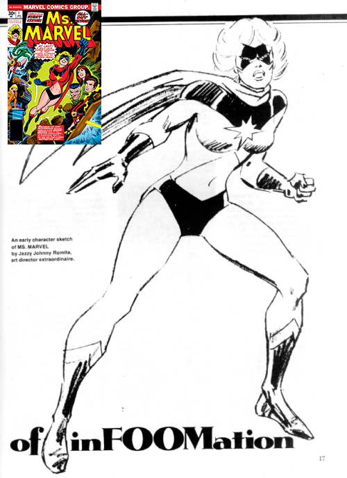 Layout inicial de Romita para a personagem e capa da primeira edição de um novo título – Ms Marvel.