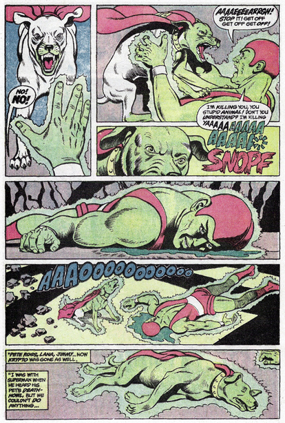 O momento mais simbólico veio em 1986, quando Alan Moore e Curt Swan encerraram a continuidade pré-Crise em Whatever Happened to the Man of Tomorrow?. Nessa história, Krypto sacrifica sua vida para proteger Superman de seu inimigo mortal. Um ato de lealdade final que encerrou a Era de Prata com dignidade e emoção.