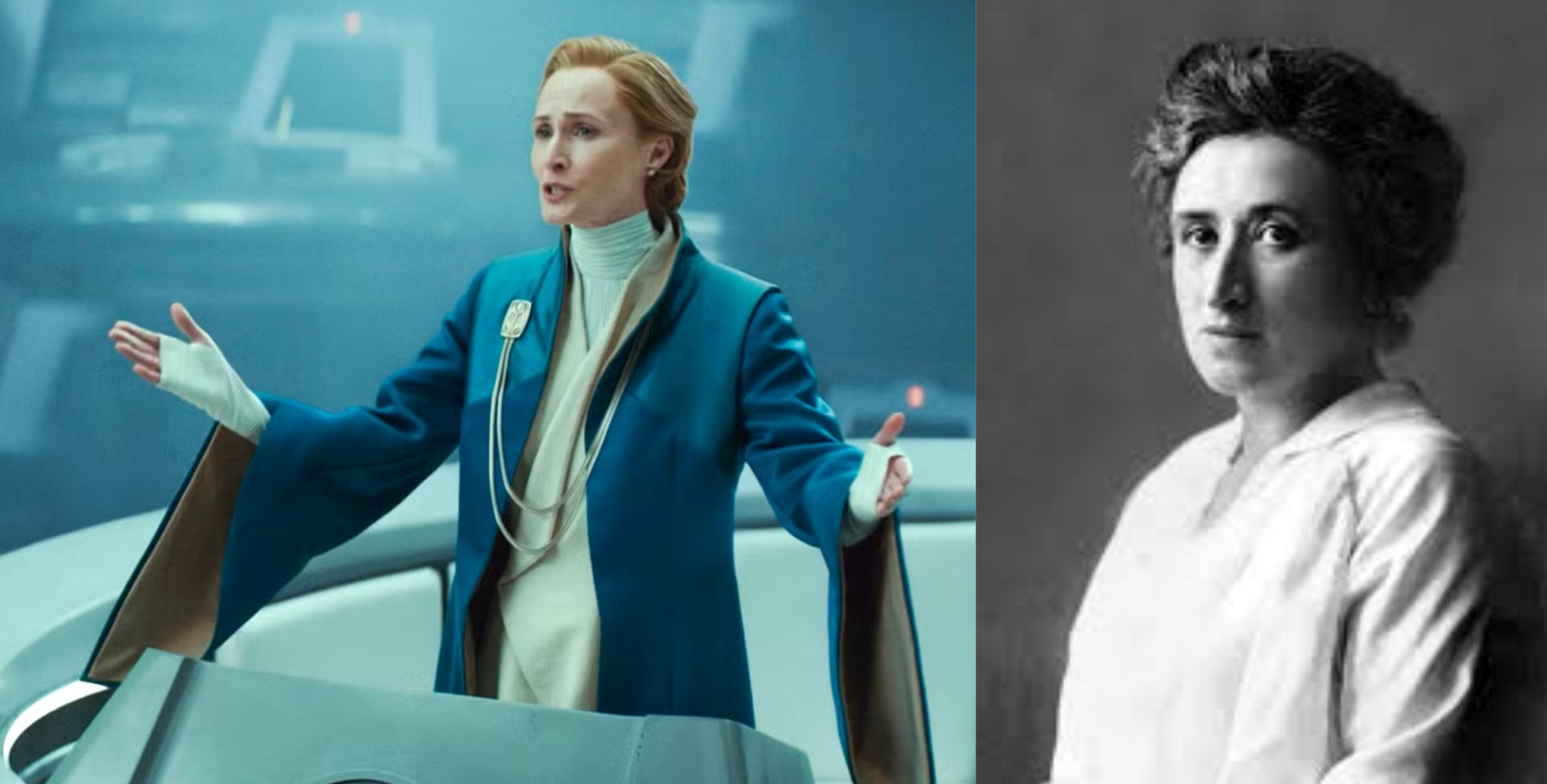 Coadjuvante decisiva desde O Retorno de Jedi, Mon Mothma é considerada uma das maiores líderes da Aliança Rebelde. A semelhança com Luxemburgo é evidente. Rosa Luxemburgo (1871–1919) foi uma filósofa, economista, teórica marxista e revolucionária polonesa naturalizada alemã, uma das figuras mais importantes do socialismo e do comunismo no início do século XX. Ativa no movimento operário da Alemanha, foi crítica tanto do capitalismo quanto das posturas reformistas do Partido Social-Democrata Alemão (SPD). Defendia a revolução socialista democrática, baseada na ação consciente da classe trabalhadora, e se opôs à participação dos social-democratas na Primeira Guerra Mundial. Junto com Karl Liebknecht, fundou a Liga Spartakus e depois o Partido Comunista da Alemanha (KPD). Participou da Revolução Alemã de 1918-1919, buscando instaurar uma república socialista. Foi brutalmente assassinada em 15 de janeiro de 1919 por grupos paramilitares a serviço do governo, tornando-se símbolo da luta revolucionária e da resistência contra o autoritarismo, tanto capitalista quanto burocrático.